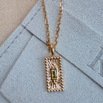 Avec sa forme rectangulaire épurée et sa pierre verte scintillante en son centre, il incarne un subtil équilibre entre minimalisme contemporain et puissance symbolique.